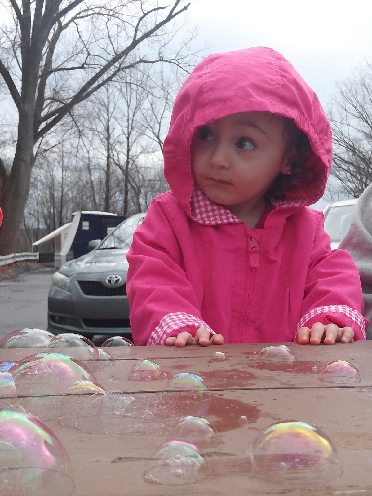 We were blessed with the opportunity to entertain two year old Elin while her parents filled out job applications. We spent some time inside reading books, playing with a truck, and about ninety seconds watching tv. Then we were outside showing Coren, who hadn't been for a visit yet, the sights. We sat at picnic tables and blew bubbles, went up and down the steps, and discovered that the front of the building was much more windy than the parking lot around back!